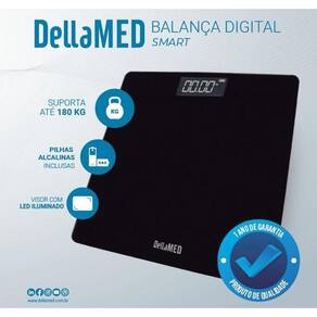 Balança Digital Smart de Alta Precisão DellamedA Balança Digital Corporal da Dellamed possui alta precisão 99% e é ultra resistente, suportando um peso de até 180 kg. Sua tela em LED permite o uso em ambientes com pouca luminosidade. Ao contrário da maioria das balanças, este modelo Smart utiliza pilhas AAA com indicação do nível de bateria, já inclusas no produto. Além disso, a balança digital da Dellamed possui resolução de tela que permite a medição de até duas casas após a vírgula, medindo de 50 em 50 gramas pesos inferiores a 100 kg. Suas linhas, cores e vidro temperado foram pensadas para deixar a balança uma peça de design decorativo em sua casa.ESPECIFICAÇÕES TÉCNICASMarca: Dellamed;Modelo: Balança Digital Corporal Smart - Cor Preta;Auto desligamento em 10 segundos;Altura do solo: apenas 20 mm. Dimensões do produto: Largura: 28 cm Comprimento: 28 cm Altura: 2 cm;Display amplo de 70 x 29 mm;Peso do Produto: 900g;Classificação Fiscal: 8423.10.00;Certificação Anvisa: 80795950001;Produto com certificação do INMETRO;CARACTERÍSTICAS- Utiliza pilhas AAA inclusas ;- 99% de precisão;- Capacidade de até 180kg;- Display em LED iluminado;- Superfina: apenas 2 cm;- Ativação automática ao subir sobre balança;- Desligamento automático após 10s;- Área: 28 x 28cm;- Indicador de carga de pilhas;- Indicador de erro de medição;- Fácil uso: Acionamento automático por toque;- Fabricado em vidro temperado ultra resistente e antiderrapante;- 4 sensores para maior precisão: resolução de 0,05kg;- 5 dígitos de medição;- Design moderno;- Zera automaticamente.GARANTIA12 meses, sendo 03 meses de garantia legal e 09 meses adicionais.CONTEÚDO DA EMBALAGEM- Balança digital corporal;- 2 Pilhas AAA;- Manual.