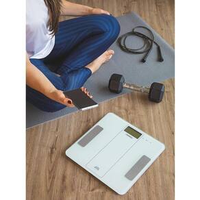 INFORMAÇÕES GERAIS - Plataforma de vidro temperado. - Gordura corporal. - Histórico de dados. - Conexão Bluetooth. - Baixe e configure o aplicativo. - Sensor de alta precisão. - Capacidade máxima: 180 kg - 2 pilhas AAA de 1,5 V (não acompanham o produto).