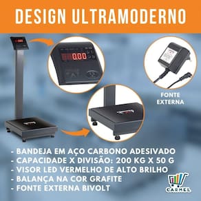 Pesagem capacidade (kg) x divisão (g): 200 x 50