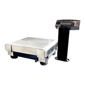 A plataforma de pesagem é construída em aço inox, enquanto a estrutura é em aço carbono e a coluna é em plástico injetado tipo ABS, garantindo durabilidade e resistência ao produto.