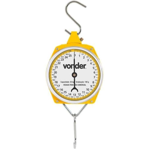 Balança Suspensa Tipo Relógio 25kg - Vonder Conteúdo da embalagem 1 Balança Aplicações e dicas de uso Indicada para pesagens em geral em chácaras, fazendas e sítios. Ideal para pesagens de ração, aves, suínos, ovinos, caprinos e produtos rurais. Possui graduação de 100 g (vetada para uso comercial). Destaques e diferenciais Confeccionada em plástico resistente e metal. Acompanha gancho para prender o material ou alimento a ser pesado. DETALHES TÉCNICOS