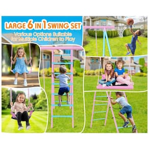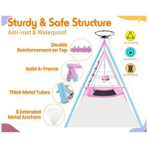 Balanço multifuncional para área externa, ideal para playground residencial, produzido em aço liga com acabamento em pintura eletrostática (powder coated) para resistência contra ferrugem. Estrutura reforçada com tubos de aço de 5 cm de diâmetro (2 polegadas) e construção em treliça tipo A-frame que garante alta durabilidade e estabilidade dimensional, prevenindo deformações em pontos críticos. O conjunto inclui 3 balanços ajustáveis em altura: balanço de plataforma tipo disco, balanço com cinto de EVA e balanço para bebê, além de escada reforçada, rede de escalada em fibra composta e cesta de basquete para atividades variadas. Área útil ampla entre os balanços para segurança, com medidas gerais de aproximadamente 385 cm de comprimento, 180 cm de largura e 185 cm de altura. Capacidade máxima combinada de até 318 kg (700 lbs), suportando crianças e adultos simultaneamente. Montagem necessária, indicada para jardins, quintais, varandas e parques.