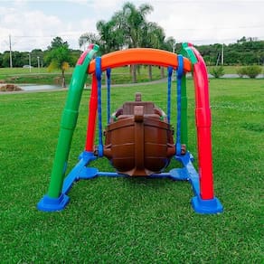 Tudo fica mais temático nesse grande balanço em formato de Barco Viking com a barra de segurança horizontal em formato de corda naval, evitando que os pequenos caiam dos assentos.