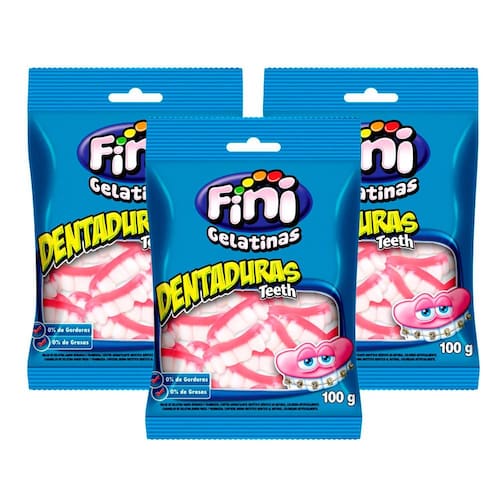 BALAS DE GELATINA FINI DENTADURAS Balas de Gelatina FINI, são coloridas, divertidas, ricas em todos os detalhes e é claro deliciosas. Opção ideal para deixar dias mais doces, decorar festas e para dar ainda mais beleza a pratos de confeitaria feitos por você. DENTADURAS FINI, no formato de dentaduras, na cor branca com rosa, no sabor de morango e framboesa. Não Contém Glúten.
