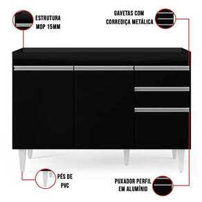 Imagine ter uma cozinha funcional, com espaço e móveis ideais para atender suas necessidades. Seria maravilhoso né!? E por que não realizar esse sonho de consumo? A D'Rossi, quer tornar sua rotina diária mais prática. Você concorda comigo que um dos lugares da casa que mais passamos horas é na cozinha, seja preparando os alimentos, ou fazendo aquela faxina não é!? Que tal economizar mais tempo investindo neste Balcão sem Tampo Beth, no tom Preto 120 cm? Uma peça funcional, durável e resistente à umidade, possibilita que você se organize melhor, tanto nos preparos dos alimentos, quanto na limpeza e organização. Produzido com materiais de ótima qualidade, sua estrutura é feita em MDP, pés em PVC, contém 3 portas com puxador em perfil metálico contendo amplo espaço interno e 2 gavetas com corrediça metálica, ideais para seus talheres, panos de pratos, dentre outros. Tenho certeza que você não vai querer ficar sem o seu! Garanta agora mesmo seu Balcão Beth.