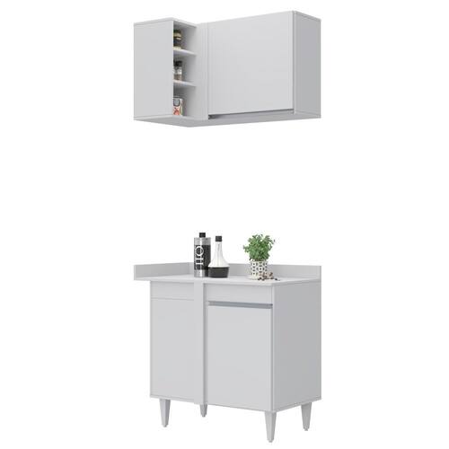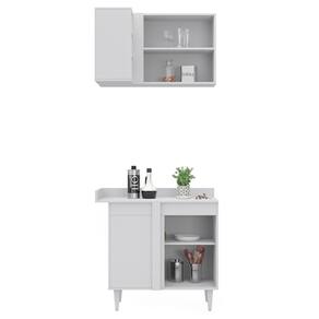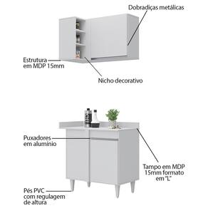 Características do Produto Material da Estrutura: MDP 15 mm. Material do Fundo: MDF 3 mm. Peso Suportado: Balcão: 28 Kg distribuídos/ Armário: 20 Kg distribuídos. Acompanha Tampo: Sim. Acabamento: Melamina BP. Escala de Brilho: Fosco. Quantidade de Portas: 2 Portas. Material da Porta: MDP. Possui Gavetas: Não. Tipo de Puxador: Alumínio. Possui Prateleiras: Sim. Quantidade de Prateleiras: 2 Prateleiras. Material da Prateleira: MDP. Montagem Flex: Pode ser montado em ambos sentidos, com o nicho para esquerda ou direita. Possui Pés: Sim. Tipo de Pés: PVC. Diferenciais: - Design moderno. - Pode ser montado do lado esquerdo ou direito. Sistema de Montagem: Cavilhas/Parafusos. Manual de Montagem: Sim. Complexidade da Montagem: Média. Volumes: 2 Volumes. Conteúdo da Embalagem: 1 Armário aéreo, 1 Balcão. Garantia do Fabricante: 90 dias contra defeito de fabricação. Montagem: Recomendamos que seja feita por um profissional. Recomendação de Limpeza: Utilize pano úmido.