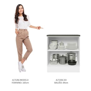 Produzido em 100% MDF, o balcão é feito com materiais de alta qualidade, como puxadores em alumínio e dobradiças metálicas.