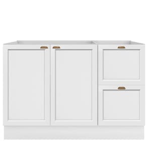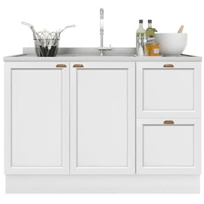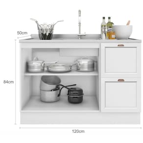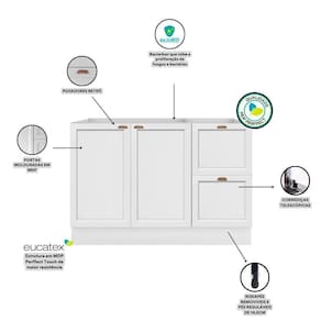 Balcão 2 Portas 2 Gavetas 120 Cm Sem Tampo Unna Poliman Branco O Balcao 2 portas 2 gavetas sem tampo Unna da Poliman Moveis e um produto elegante ideal para ser utilizado como balcao para pia 1,20m x 0,50 m (tampo vendido separadamente. Sao 2 portas de bater com dobradicas reforcadas de 35mm e prateleira interna, 2 gavetas com corredicas telescopicas que permitem abertura total, possui puxadores modelo retro em polimero com acabamento em alta cobertura para deixar seu movel ainda mais elegante, contem pes em PVC regulaveis ao piso de 14,5cm que permitem o nivelamento perfeito, tambem acompanha rodapes removiveis com presilhas modelo click que facilita na hora de fazer a limpeza . Estrutura em MDP Perffect Touch de maior resistencia e com protecao Bacterban que inibe a proliferacao de fungos e bacterias na superficie do movel, as portas e gavetas sao almofadadas/molduradas em MDF inspiradas nas classicas cozinhas . Produto ecologicamente correto com embalagens preparadas para evitar e permitir que o produto chegue em perfeito estado em sua casa. Perfeita combinacao com os mais variados ambientes. Qualidade que so a Poliman oferece em seus produtos. Dimensoes: Altura: 83,5 cm Largura: 120 cm Profundidade: 50 cm Peso: 34 Kg