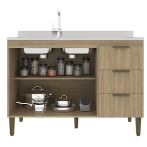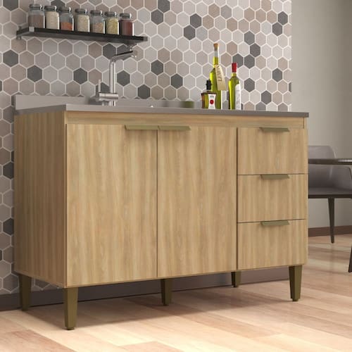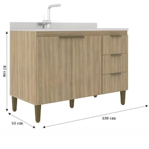 Características: Estrutura em MDP Puxadores perfil Corrediças metálicas Pés em polipropileno Altura dos pés: 17 cm Gaveta suporta até 5 kg Prateleiras suporta até 10 kg Não acompanha pia