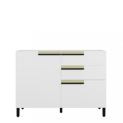 Características: 2 Portas, sendo uma porta temperos 3 Gavetas Acabamento pintura UV Corrediças telescópicas Dobradiças caneco 35MM com amortecimento Estrutura em MDP 15mm Fixação com minifix Puxadores em madeira Pés c/ sapata regulável plástica