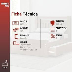 Itens Inclusos: 1 Balcao 80cm 2 Portas Decibal Munique 1 Kit de ferragens 1 Manual de montagem Material/Composicao: MDP Numero de Pes: 4 Numero de Portas: 2 Numero de Prateleiras: 2 Tipo de Porta: Basculante Tipo: Simples Acompanha Tampo: Sim Necessita Fixacao na Parede: Nao Possui Espelho: Nao Possui Opcao de Montagem Inversa: Nao Toalheiro: Nao Possui Vidro: Nao