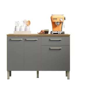 Com madeira reconstituída, que respeita o meio ambiente. Composto de três portas e uma gaveta, onde são utilizadas dobradiças e corrediças metálicas, tampo que traz a praticidade de utilização de decorações, utensílios para cozinha e até mesmo eletrodomésticos. Os puxadores são ergonômicos em plástico resistente -poliestireno-. Possui pés reguláveis em plástico resistente que garantem a estabilidade do produto. Acabamento com pintura UV.