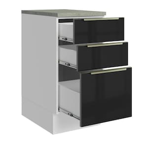 O balcão possui três gavetas grandes, sendo a última mais profunda, todas com puxadores em alumínio e corrediças telescópicas que possibilitam a abertura total.