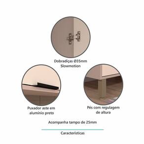 Caracteristicas Estrutura: MDP 15mm Acabamento da Caixaria/Corpo: PF Acabamento das Portas/Frontal: BP Quantidade de Portas: 2 de Abrir Tipo de Dobradicas: Metalicas 35mm Slow Motion Quantidade e Tipo de Puxadores: 2 Puxador em Aluminio Preto Quantidade de Prateleiras: 1 Tipo do Tampo: MDP 25mm com acabamento BP Com Rodatampo: Sim, em MDP 15mm, acabamento BP e 6cm de altura Sistema de Montagem: Cavilhas e parafusos. Garantia do Fabricante: 3 meses Itens inclusos: Balcao com tampo, manual de montagem, ferragens e acessorios.