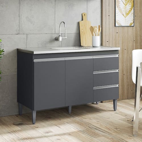 Características: Estrutura MDP Pintura UV 02 Portas com Dobradiças metálicas 03 Gavetas com Corrediças Metálicas 01 Prateleira com amplo espaço Pés de Plástico Estrutura da Pia em Aço Inox Design moderno Concreto aerado Cuba com rebaixe novita Furo para fixação da torneira Superfície plana com canais inclinados Fechamento em dois estágios Acompanha válvula com Pegador em ABS cromado Acompanha Pia e Cuba com Válvula GhelPlus. NÃO ACOMPANHA TAMPO.