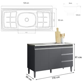Dimensões do Balcão: Altura: 81 cm Largura: 116 cm Profundidade: 50 cm Dimensões da Pia e Cuba: Altura: 13,5 cm Largura: 120 cm Profundidade: 53 cm