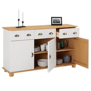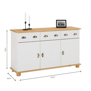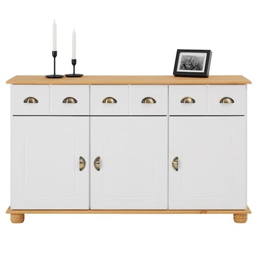 Os puxadores metálicos em estilo concha e os pés torneados reforçam o estilo retrô sofisticado, enquanto o tampo em madeira natural oferece um espaço elegante para decorar. É a escolha perfeita para quem busca durabilidade, beleza e versatilidade em um só móvel.