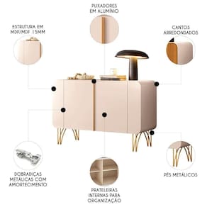Ideal para sua Sala de Jantar seu espaço interno permite uma organização eficiente, ideal para armazenar utensílios, louças ou objetos decorativos, mantendo o ambiente sempre arrumado e sofisticado. O buffet possui duas portas com dobradiças laterais e puxadores em alumínio na cor dourada, que conferem um toque de luxo e modernidade ao móvel. O sistema de amortecimento para as portas garante que o fechamento seja suave e silencioso, evitando impactos e proporcionando maior durabilidade ao móvel. Os pés duplos em aço maciço 3/8 dourado oferecem uma base robusta e estilosa, complementando o design sofisticado do Balcão Buffet. Produzido com materiais de alta qualidade, como MDF e MDP de 15mm, o móvel apresenta resistência e estabilidade. Esse Aparador é uma excelente escolha para quem busca um móvel funcional, com um toque de elegância e durabilidade para complementar a decoração de sua casa.