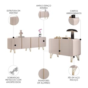 Ambos possuem portas com dobradiças metálicas, puxadores em alumínio dourado e sistema de amortecimento para um fechamento suave e silencioso. Os pés duplos em aço maciço dourado complementam o design sofisticado do Aparador Buffet. Produzidos com materiais de alta qualidade, como MDF e MDP de 15mm, oferecem resistência e estabilidade. Com cantos arredondados e amplo espaço interno, os Buffets são perfeitos para guardar louças e talheres, garantindo organização e fácil acesso. Elegância, funcionalidade e durabilidade definem este conjunto de Balcão Buffet, valorizando a decoração da sua casa com um toque contemporâneo e prático. É uma excelente escolha para quem busca estilo e praticidade em um único produto.