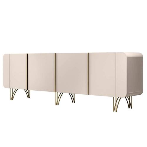 Ele possui cantos arredondados e amplo espaço interno, perfeito para guardar louças, talheres e outros objetos. O Buffet Aparador conta com 04 portas com dobradiças laterais e puxadores em alumínio com acabamento dourado, que conferem um toque de sofisticação ao produto. Além disso, ele possui um sistema de amortecimento para portas, que garante um fechamento suave e silencioso, evitando danos ao móvel e ao piso. Os pés em aço maciço em tom dourado são resistentes e harmonizam com o design do Buffet. O móvel é produzido em MDF e MDP de 15mm, materiais de alta qualidade e durabilidade. O Balcão Buffet é uma peça versátil e charmosa, que vai valorizar o seu ambiente com estilo e praticidade.