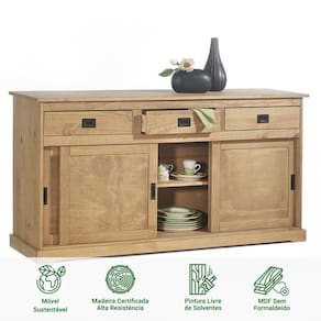 Isso mesmo! Estamos falando do Balcão Aparador 3 Portas 3 Gavetas Savona, já pensou em organizar seus objetos com praticidade em um móvel com design rustico e sustentável? Pensando nisto, nosso Balcão Aparador 3 Portas 3 Gavetas Savona é bem distribuído para seu ambiente, assim, suporta organizar seus objetos de maneira eficaz. Possuindo três gavetas e três portas de correr, assim, auxiliando para sua organização. O Balcão Aparador 3 Portas 3 Gavetas Savona é um produto versátil sendo capaz de compor sua sala de estar ou jantar. Seu design possui rodapé rústico com linhas retas. Nossa madeira é proveniente de recursos naturais e é tratada de forma ecologicamente correta para o bem do meio ambiente. Pensamos também na saúde de sua família utilizando pinturas livre de solventes e sem formaldeído.