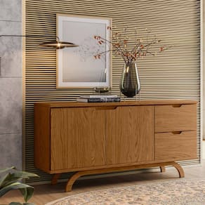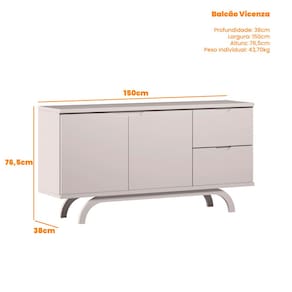 O Balcão Aparador para Sala de Jantar 1,50m Vicenza conta com um tampo em MDF de 15mm, 2 portas e 2 gavetas com estrutura 100% em MDF. Possuí tinta protetiva nas portas e gavetas aumentando a durabilidade do produto.