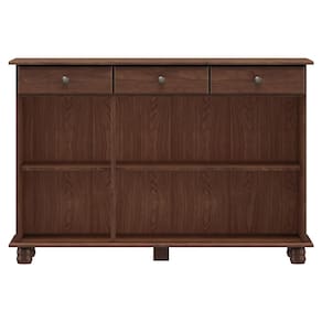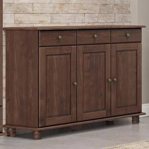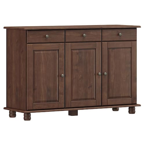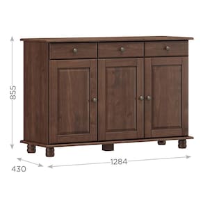 O Balcão Aparador Rubi da Finestra Móveis combina elegância e funcionalidade, sendo fabricado com estrutura em madeira maciça de pinus de reflorestamento e acabamento em pintura acetinada com verniz PU e UV. Conta com três portas equipadas com dobradiças com amortecimento e prateleiras internas em madeira maciça que suportam até 10kg distribuídos. Possui ainda três gavetas com corrediças telescópicas e capacidade para até 5kg cada, oferecendo amplo espaço para organização. Os puxadores metálicos em ouro envelhecido e os pés torneados em madeira maciça acrescentam um charme clássico ao design, tornando a peça ideal para salas de jantar, estar ou halls de entrada.