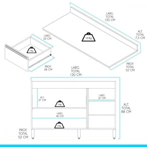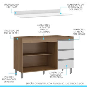 Dimensões do Balcão: Altura: 88 cm Largura: 120 cm Profundidade: 52 cm Peso: 30 kg