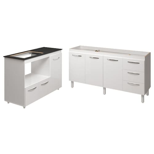 Balcão Armário Gabinete De Pia 150 Cm Deise E Balcão Alana Para Fogão Cooktop 4 Bocas E Forno Elétrico Branco Confira o Balcão de Pia 150 cm + Balcão para Cooktop e Forno, a combinação perfeita de praticidade e estilo para sua cozinha. Com design moderno e elegante, esse conjunto conta com um gabinete espaçoso para pia com 3 portas e 3 gavetas, além de um balcão exclusivo para cooktop e forno, proporcionando mais organização e funcionalidade ao ambiente. Feito em MDP com acabamento sofisticado, os puxadores cromados e os pés reguláveis garantem maior durabilidade e fácil nivelamento. Características do Balcão de Pia Deise 148 cm: Altura: 83,5 cm (com pés) | 69 cm (sem pés) Largura: 148 cm (ideal para pia de 150 cm) Profundidade: 50 cm Material: MDP (madeira) Portas: 3 Gavetas: 3 Prateleiras: 1 Puxadores: 6 plásticos cromados Pés: 6 reguláveis de plástico (altura: 16,5 cm, ajustáveis até 18 cm) Corrediças: Metálicas Tampo incluído: Não Indicação de uso: Cozinha