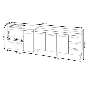 Características do Kit Montado: Largura total: 262 cm Profundidade: 50 cm Altura: 85,5 cm (com tampo do balcão de cooktop)