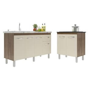 Balcão Armário Gabinete Para Pia 138 Cm Camila E Balcão Fran Para Cooktop 4 Bocas Savana Off White Transforme sua cozinha em um espaço mais atraente e elegante com o Kit Balcão para Pia de 140 cm Camila e Balcão para Cooktop Fran 4 Bocas. Este conjunto foi desenvolvido com materiais de alta qualidade, pintura UV e acabamento impecável, proporcionando beleza e praticidade ao ambiente. É o complemento que faltava para tornar a sua cozinha um lugar especial! Adquira já o seu! Características do Balcão de Pia Camila 138 cm: Altura com pés: 83,5 cm Altura sem pés: 67 cm Largura: 138 cm (Padrão para pia de 140 cm) Profundidade: 50 cm Material: MDP (Madeira de Média Densidade) Portas: 4 portas Gavetas: 1 gaveta Prateleiras: 1 prateleira Puxadores: 6 puxadores plásticos cromados Pés: 6 pés reguláveis de plástico Altura dos pés: 16,5 cm Regulagem dos pés: Somente para nivelamento (chega no máximo a 18 cm) Corrediças: Metálicas Indicação de uso: Cozinha Acompanha tampo: Não