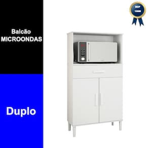 Além de ser um balcão e suporte para microondas e forno, este móvel também pode ser utilizado como um armário para armazenamento de utensílios e alimentos.