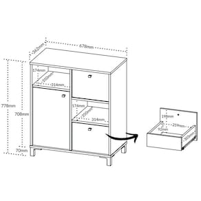 - Estrutura em MDP 15mm com fita de borda ABS com 0,45mm de espessura; - Puxadores em metal; - Uma porta em MDP 15mm com fita de borda ABS 0,45mm de espessura; - Prateleira interna móvel com três regulagens de altura; - Duas gavetas com corrediças metálicas, fundo encaixado em MDF 3mm - Frente em MDP 15mm com fita de borda ABS com 0,45mm de espessura; - Fixação com tambor, minifix e parafuso. - Capacidade de carga: 10kg distribuídos no tampo, 5kg distribuídos na prateleira; 10kg distribuídos na base, 5kg distribuídos em cada gaveta.