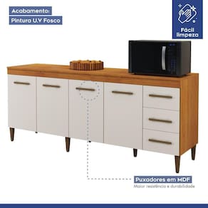 Preparar aquela receita especial vai ficar muito mais prático com a presença do Balcão Atenas. Além de oferecer nichos de tamanho ideal para acomodar panelas, produtos de mercearia e até eletrodomésticos, ele também conta com gavetas para guardar talheres, panos de prato e utensílios indispensáveis na hora de cozinhar - o tampo também é uma ajuda e tanto para picar alimentos ou apoiar itens de decoração! Por fora, a estrutura básica e cor leve são ótimas para ajudar a compor o espaço gourmet dos sonhos já que harmonizam bem com outras tonalidades e acessórios que usar para criar um cantinho com a sua personalidade. Daí é só combiná-lo com armários aéreos ou paneleiros e aproveitar as vantagens de ter tudo fácil de alcançar e bem organizado. Balcão Atenas 4 Portas e 3 Gavetas : Escala de Brilho:Semi-Brilho Ambiente Principal: Cozinha Altura : 86cm Largura: 201cm Profundidade: 53cm Peso: 61,8 Acabamento: Pintura Texturizada UV Material Principal: MDP Possui Portas: 04 Material da Porta: MDP Acabamento da Porta: Pintura UV Escala de Brilho da Porta: Semi-Brilho Tipo de Porta: Bater Tipo de Puxador da porta: Externo Material do Puxador da Porta: MDF Tipo de Dobradiça/Corrediça da Porta: Metálica Possui Prateleiras :02 Material da Prateleira: MDP Acabamento da Prateleira: Pintura Texturizada UV Escala de Brilho da Prateleira: Semi-Brilho Peso Máximo por Prateleira: 20 Tipo de Madeira Maciça da Prateleira: Possui Gavetas: 03 Gaveta com Chave : Não Material da Gaveta: MDP Acabamento da Gaveta: Pintura UV Escala de Brilho da Gaveta : Semi-Brilho Tipo de Corrediça da Gaveta: Metálica Telescópica Tipo de Puxador da Gaveta: Externo Material do Puxador da Gaveta: MDF Peso Máximo por Gaveta: 5 Possui Pés: 08 Altura dos Pés: 17 Material dos Pés: Plástico Acabamento dos Pés: Liso Sapatas Niveladoras: Não Pés Reguláveis : Sim Material do Tampo: MDP Acompanha Tampo: Sim Suporta Granito : Não Balcão Acompanha Pia: Não Medida do Tampo (L x C x E): 201cmx53cmx1,5cm Estilo: Moderno Recomendações de Uso, Manutenção e Limpeza: Recomendamos que a limpeza seja feita apenas com pano umedecido. Sistema de : Parafusos Itens Inclusos: 1 Balcão e manual de .