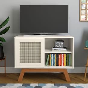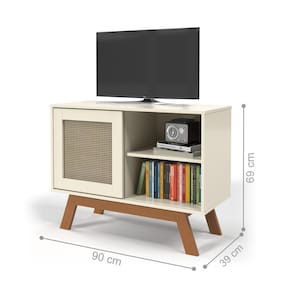 O produto dispõe de 1 porta de correr feita em rattan sintético, para guardar o que desejar, e 1 prateleira para que você utilize da forma que preferir.