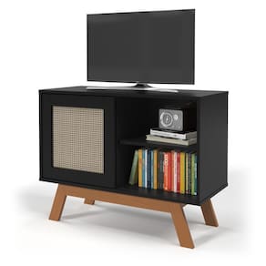 O produto dispõe de 1 porta de correr feita em rattan sintético, para guardar o que desejar, e 1 prateleira para que você utilize da forma que preferir.