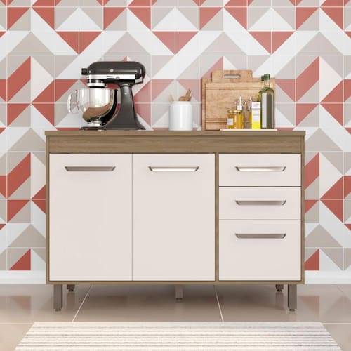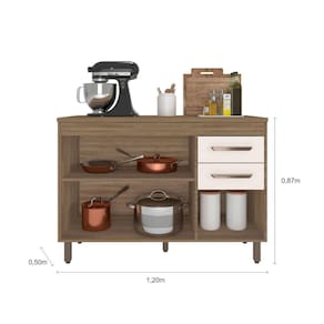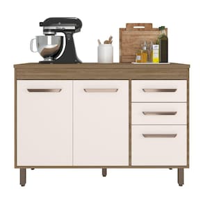 São 3 portas de bater com prateleira interna, dobradiças reforçadas de 26mm, 02 gavetas com corrediças metálicas, balcão com tampo de 15mm na medida 1,20m x 0,50m que se retirado pode acomodar pia, puxadores modernos em polímero bronze e pés em PVC reguláveis ao piso de 17cm que permitem o nivelamento perfeito.