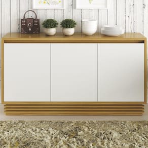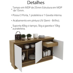 Balcão Buffet 3 Portas 160 cm BB2610, possui design retrô e sofisticado, entregando ao ambiente ar de requinte e muita modernidade. Estrutura em MDP de 15mm, já o tampo, as laterais e a base são de 25mm de espessura, proporcionando maior durabilidade e resistência a peça, contando com acabamento em pintura UV (semi - brilho). Composto por 3 portas com dobradiças metálicas, 1 prateleira com amplo espaço para armazenar diversos itens e 1 gaveta com corrediças metálicas. Suportando até 40kg o tampo, 5kg a gaveta e 10kg a prateleira. Perfeita para deixar seu ambiente produtivo, belo e organizado, ideal para compor sala de jantar, salas de estar, como divisor de ambientes ou até mesmo no hall de entrada. Este móvel chegará na sua casa separado em 2 volumes.