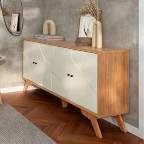 O Balcão Buffet Mosaico da Dalla Costa combina alta qualidade e design moderno, utilizando matérias-primas sustentáveis. Desenvolvido 100 com MDF, contém detalhes em 3D uma pintura durável com proteção UV. Com puxadores metálicos e dobradiças com amortecedor, suas 4 portas se fecham suavemente. O padrão de mosaico em 3D adiciona um toque contemporâneo e suave a qualquer espaço. Além disso, sua versatilidade permite que seja utilizado como balcão aparador na sala de estar ou para armazenar louças na sala de jantar.