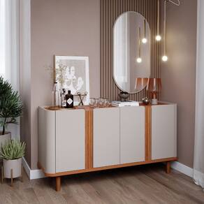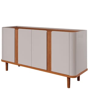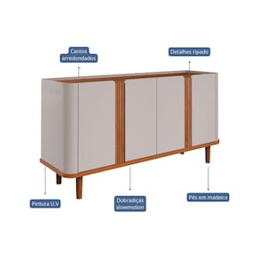 O Buffet Eva da Cimol combina requinte e estilo para modernizar seu ambiente. Ele oferece funcionalidade para organizar louças e utensílios, com acabamento em laca, pintura U.V, cantos arredondados, detalhes ripados, dobradiças slowmotion, e pés em madeira. Ideal para quem busca sofisticação e funcionalidade.