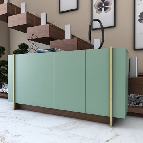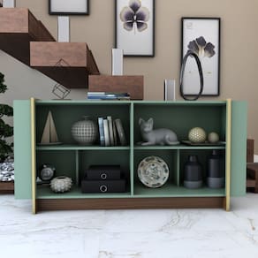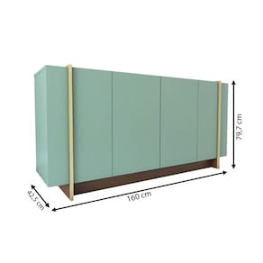 O(a) Balcão Buffet Balneário Camboriú 4 Portas 2 Prateleiras Hortelã/Dourado - Loja é produzido em MDP na escala de brilho Fosco, e possui um grau de dificuldade de montagem: Médio.