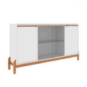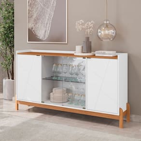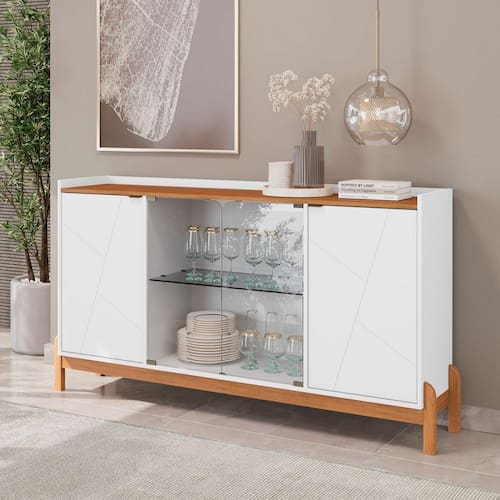 O(a) Balcão Buffet Bari 4 Portas 3 Prateleiras com Vidro Branco/Cedro - Casa D é produzido em MDF e MDP, e possui um grau de dificuldade de montagem: Médio.