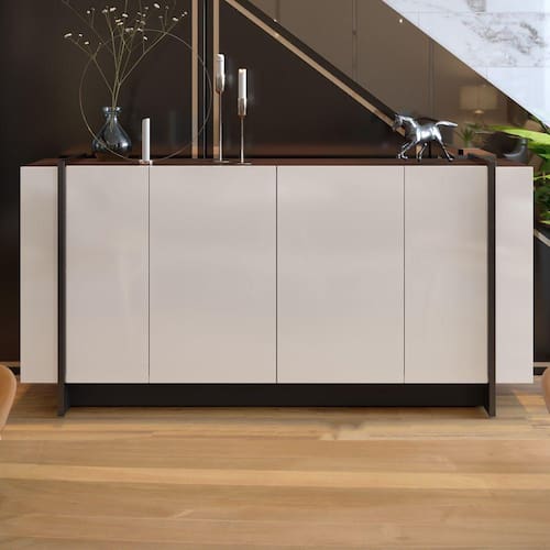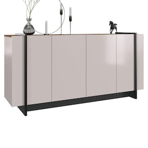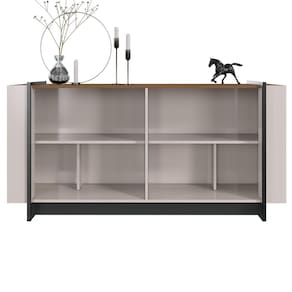 O(a) Balcão Buffet Copacabana 4 Portas 2 Prateleiras Off White/Nogueira Real/Preto Fosco - Colibri é produzido em MDP na escala de brilho Fosco, e possui um grau de dificuldade de montagem: Médio.