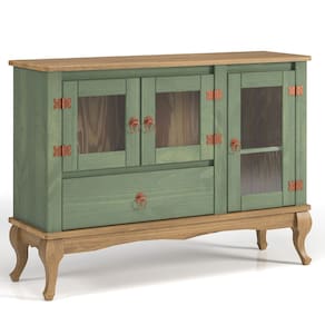 - Acabamento: Cera na cor verde oliva com veios e nós aparentes | Tampo: cera na cor marrom antique.
