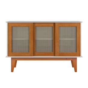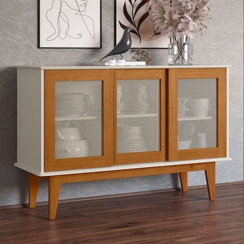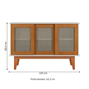 O(a) Balcão Buffet Detroit 3 Portas 3 Prateleiras Off White/Nature - Tebarrot  é produzido em MDF, MDP e Pinus na escala de brilho Semi-Brilho, e possui um grau de dificuldade de montagem: Médio.