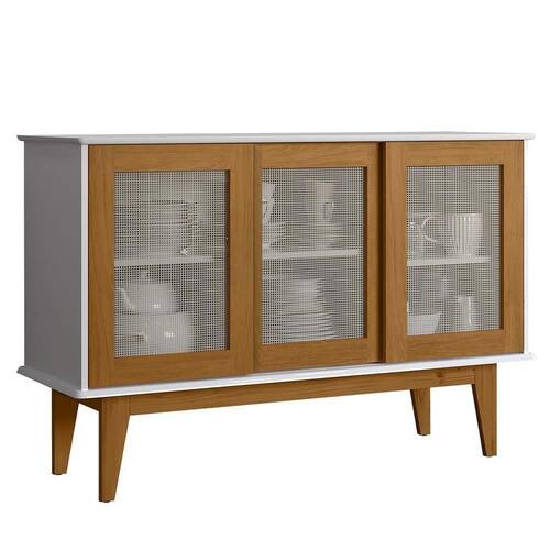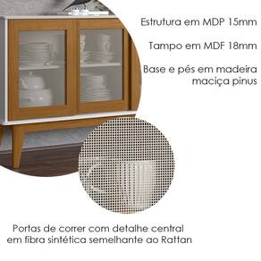 Balcão Buffet projetado para transformar seu ambiente com praticidade e estilo. Possui 125 cm de largura, estrutura em MDP de 15 mm e tampo em MDF de 18 mm. Sua base e pés são confeccionados em madeira maciça de pinus, proporcionando maior resistência e durabilidade. Com acabamento em pintura semibrilho, o móvel conta com 3 portas de correr com detalhe central em fibra sintética semelhante ao Rattan, além de prateleiras e divisórias internas que facilitam a organização. Este móvel chegará em sua casa separado em 01 volume.