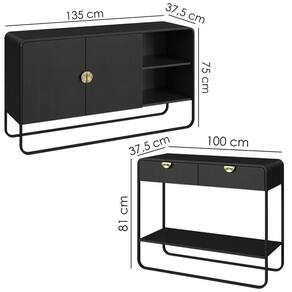 Conjunto de Buffet e Aparador com design orgânico e contemporâneo, ideal para compor salas de jantar com estilo e funcionalidade. Estrutura em MDP 15 mm, cantoneiras em MDF e acabamento em pintura BP. Possui 2 portas com dobradiças metálicas, 2 gavetas com corrediças telescópicas, prateleiras internas e externas, puxadores em poliestireno, pés em metal e sapatas plásticas que protegem o piso contra riscos. Produto entregue em 02 volumes.