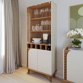 MDP, MDF, Madeira maciçaEncante-se com o Balcão Buffet e Cristaleira com Adega Madrid C05 Off White Matte/Freijó, da Mpozenato, uma combinação perfeita de design retrô e contemporâneo expressos em cada detalhe. Ambas as peças com pés de madeira maciça harmonizam facilmente com as linhas orgânicas, com o aplique ripado e com a porta de quina usinada, adicionado um conferem um visual único e sofisticado ao móvel.