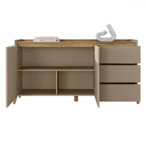 O(a) Balcão Buffet Rennes 3 Gavetas 2 Portas Hannover/Marrom Claro - Casa D é produzido em MDF e MDP na escala de brilho Semi-Fosco, e possui um grau de dificuldade de montagem: Médio.