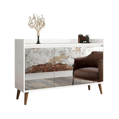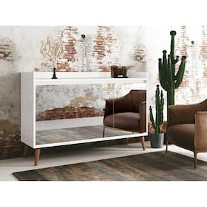 Ideal para organizar melhor sua sala de jantar ou de estar, o Balcão Buffet Retrô com Espelho Delta 3 Portas - MoveisAqui trouxe de volta a pegada retrô que veio para ficar. Os pés estilo palito, levemente angulados, se destacam pelo charme que garante à peça. Seus compartimentos internos são ideais para armazenar e organizar diversos tipos de objetos pessoais, além de seu aparelho de jantar e demais itens que sejam necessários. Lindo, robusto e versátil, garante um espaço moderno e organizado. Dimensões do Produto Montado: Altura: 98,5 cm Largura: 119,5 cm Profundidade: 45 cm Observações: - Produzido em MDP; - 3 portas com dobradiças metálicas; - Pés palito, estilo retrô, em madeira pinus; - Peso suportado por prateleira: até 7kg; - Portas com espelho incluso; - Pintura Ultravioleta com acabamento brilho.